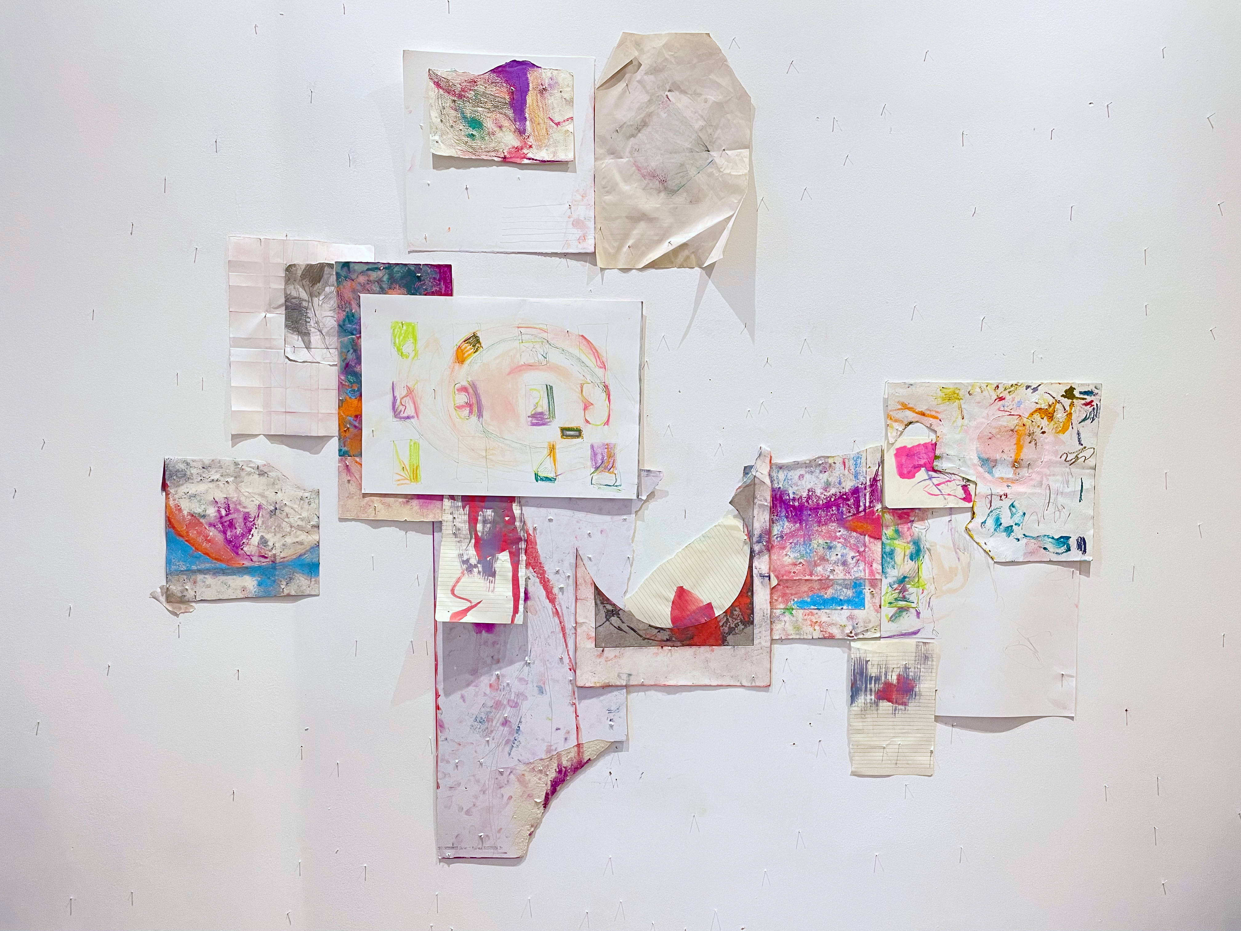 Over the last while my practice has become a loop of sorts; a recycling of works previously made; aiming to generate new ideas, new visual configurations, all while using bits and pieces that have already been part of that journey. It is a nod to being more thoughtful about material usage, but also my intention and thought process on why a piece of artwork needs to have resolution / an end, and what that even means. I’m also exploring the idea that everything is a response - a dialogue, a relationship between things - and that my art is a product of my mind-body, brain-body experience of making it. Like most things, it’s asking more questions than it is finding answers.